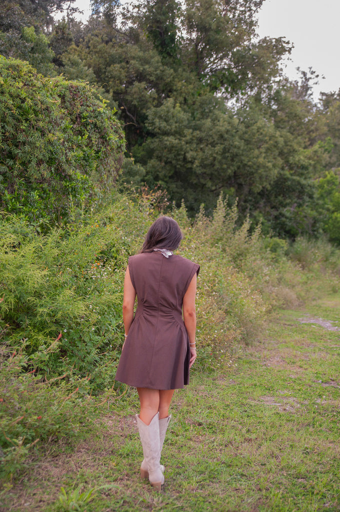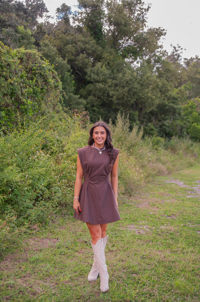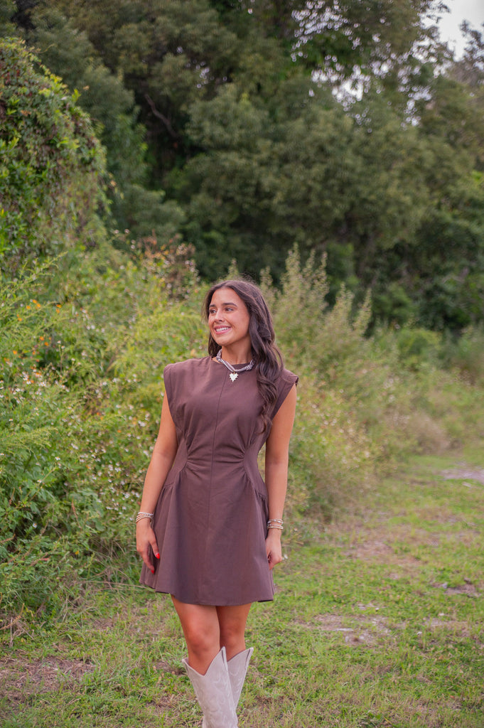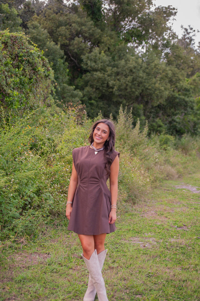 Ana Mini Dress has a cut-in waist that gives a flattering silhouette and the rich warm chocolate hue makes it perfect for your fall calendar. This mini is a balance between sophistication and edgy with a sleeveless design and clean lines. Pair with your favorite boots or flats for multiple looks.