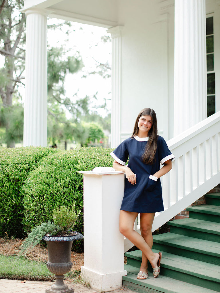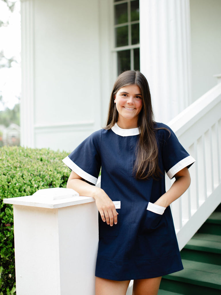 Elle Mod Mini Dress is the modern-day look of this retro fit. Structured from cotton twill, it features a playful A-line silhouette, crisp white trim, and patch pockets on the front. The navy shade adds a timeless look. Perfect for brightening up your everyday. Style with the latest flat shoe or a wedge for a polished and fun look.