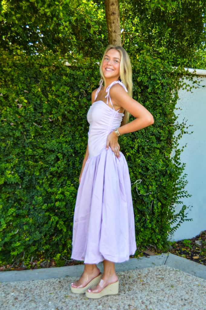 Clara Puff Midi Dress features a strapless neckline, flattering ruched sides, and a voluminous, lined midi skirt. The soft lilac hue adds a touch of romance. Perfect for a wedding, shower, or any occasion that calls for soft glam. Runs Small.