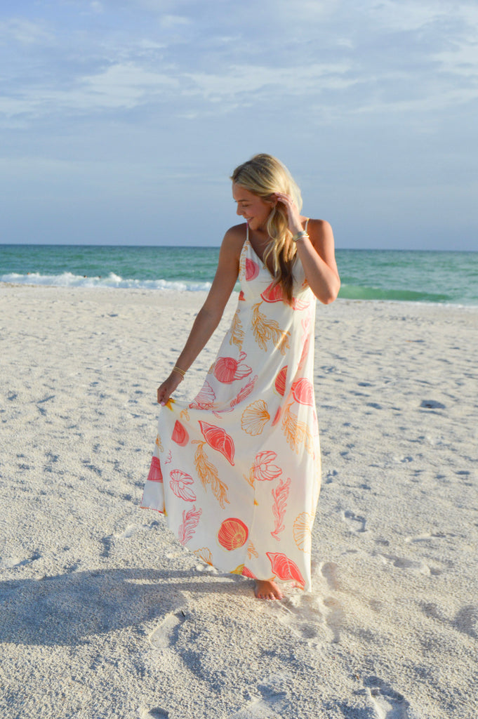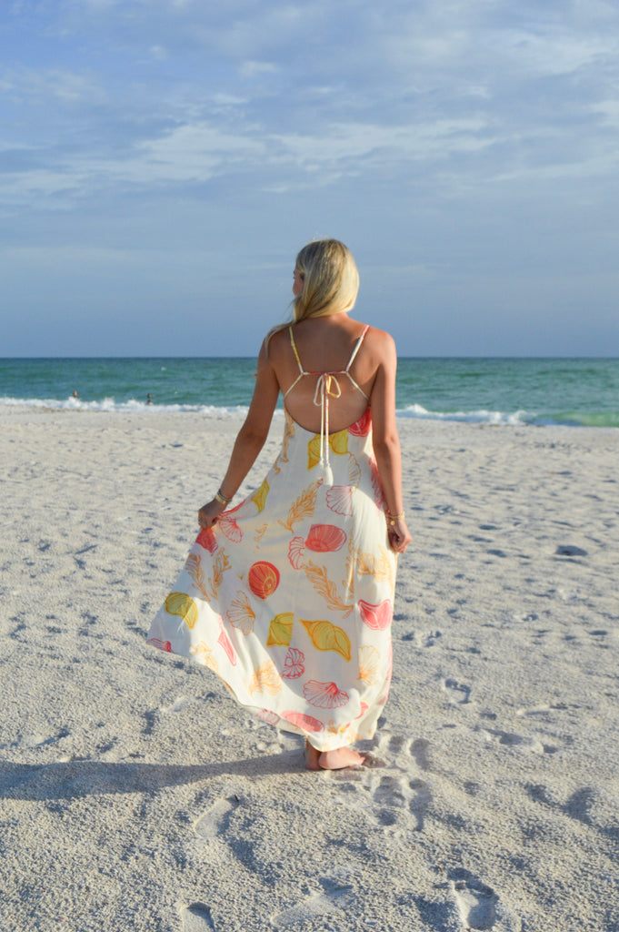 Marley Beach Maxi Dress has a delicate shell print that adds a coastal touch, while the full lining keeps things comfy and chic. The coral, red, and cream palette is soft yet striking, and it is the perfect pick for sunset dates, beach parties, or dreamy getaways. The Marley has an adjustable tie and open back for an airy feel and effortless look.