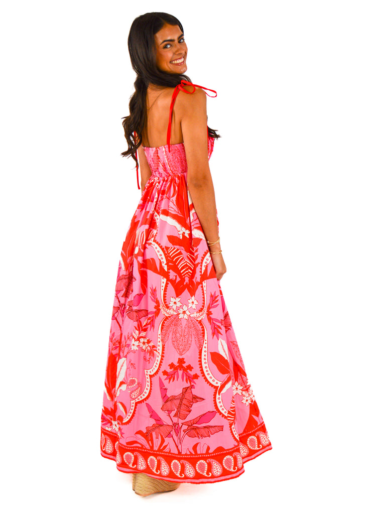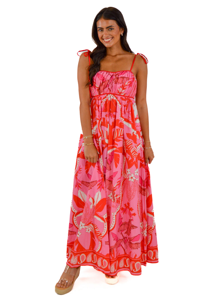 Haisley Printed Maxi Dress has a beautiful print in the perfect shades of red and pink. This maxi dress has adjustable shoulder tie straps, an elastic back bust line, and a breezy fit. The bright and bold look of this silhouette takes you from day to night. Look sophisticated and feminine in this striking dress.