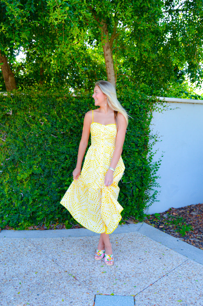 Kira Yellow Eyelet Woven Dress is beautifully embroidered and so lightweight. The bright color and striking design are perfect for any occasion. Kira dress has adjustable straps and a smocked back for any easy fit. This is the dress for showers, brunch dates, sorority events, and more. You will feel cheerful and confident in this flattering silhouette. The bust is fitted, so size up if you are a 34B or larger.