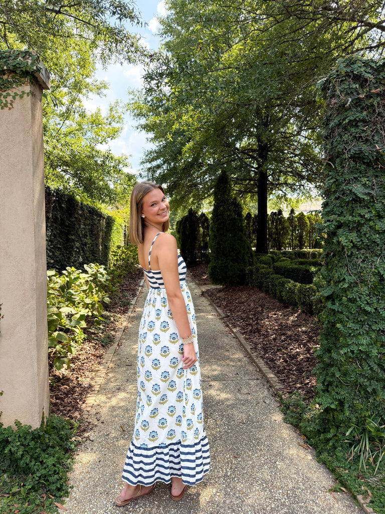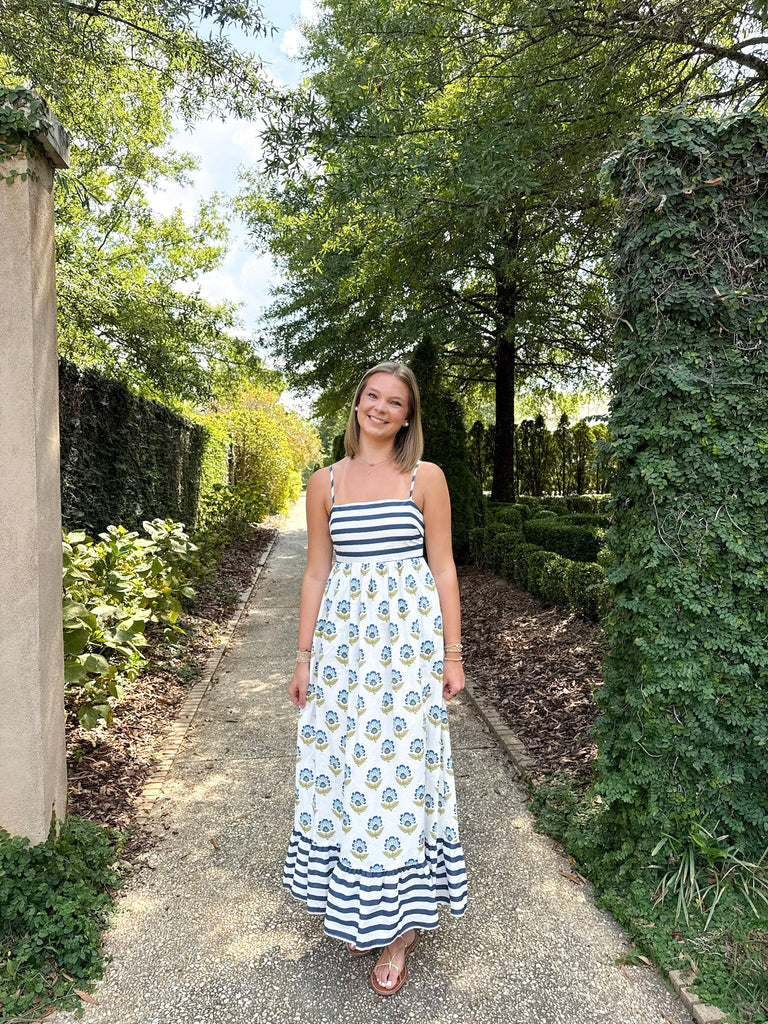 Margot Block Print and Stripe Maxi Dress has the most beautiful colors of navy, off white, and chartreuse. This dress will take you into fall while the weather is still warm, and then throw a cardigan over your shoulders as the weather gets cool. The Margot features adjustable straps and a smocked back for a comfortable fit. This classic print with a twist will get you all the compliments.