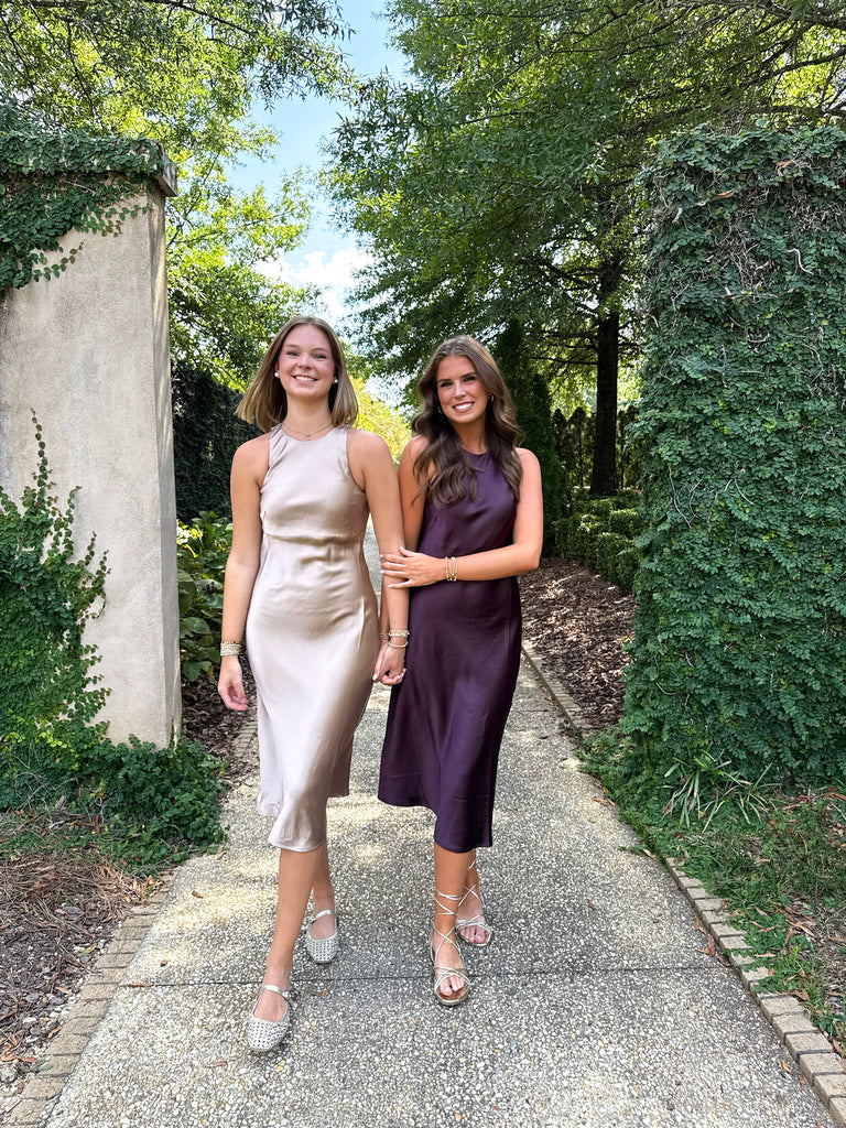 Reagan Satin Midi Dress is sleek, polished, and chic. With a flattering high neckline and silky smooth finish, it drapes for a beautiful silhouette. Perfect for date night, dinner out, or drape a cardigan over your shoulders for a more casual look. The rich color will bring you to instantly want all things fall.