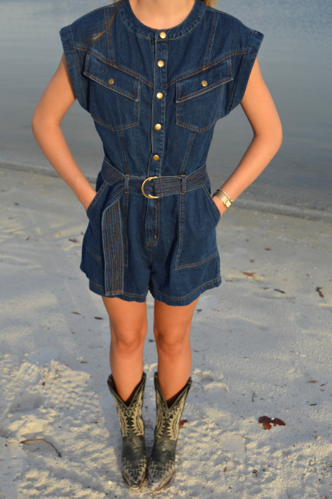 Elizabeth Denim Romper has a flattering round neckline, easy button-down front, and casual cuffed sleeves. This one-piece wonder is as cute as it is convenient. The self-tie belt cinches the waist just right, while side pockets keep things playful and practical. Whether you're heading to a weekend concert, eating at a BBQ, or just meeting the girls to shop, this is your instant outfit solution. You will be ready for whatever is next in this stylish fit.