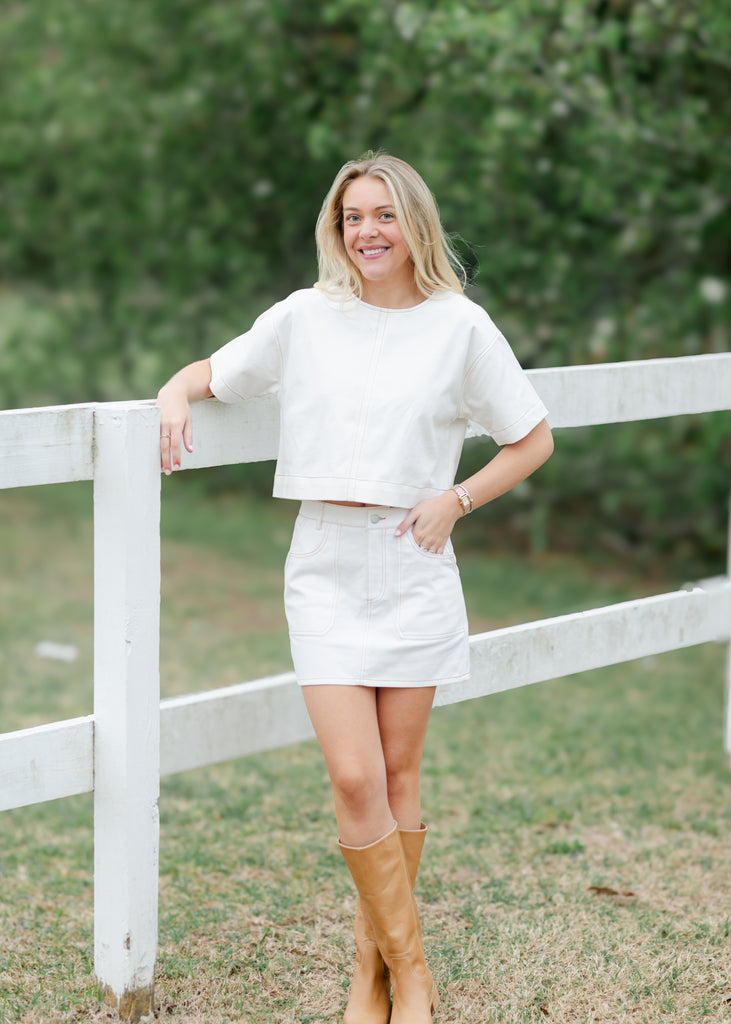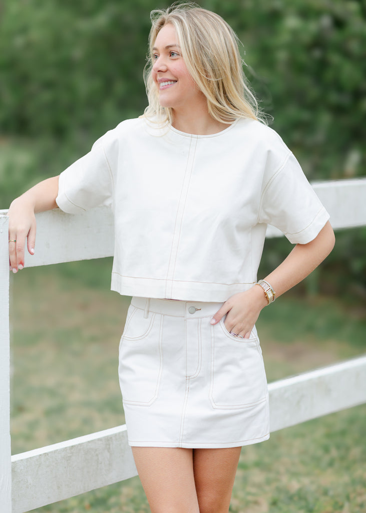 Lottie Cream Top and Skirt Set is so versatile. This set has great stretch and can be worn during all seasons. Wear as a set or mix it up, this neutral cream tone makes it perfect for accessorizing your way. It has a lightweight feel and subtle contrast stitching.