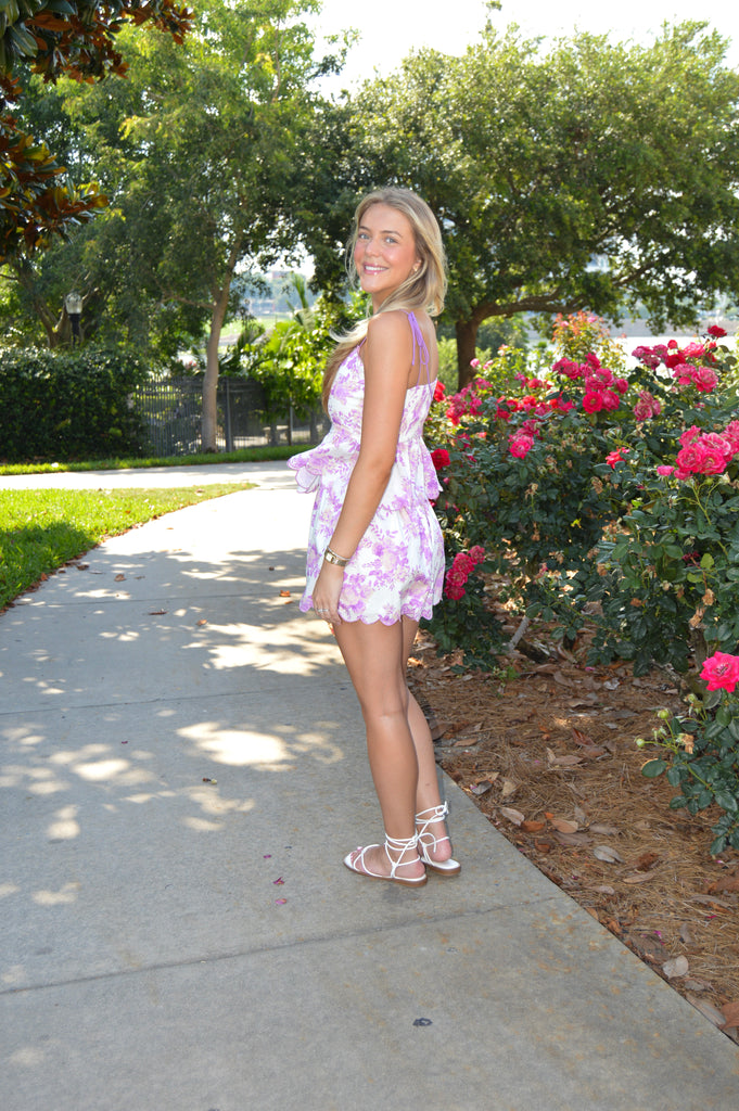 Pearl Ivory and Lavender Set has a scalloped neckline and short's hem, a peplum top, and the most beautiful floral print for a timeless look. This feminine set is fresh and chic. There is smocking in the back of the top and shorts, for a fitted, yet comfortable feel. You will look dreamy in this lightweight set, perfect for the sunny days ahead.