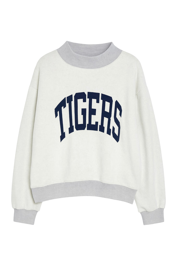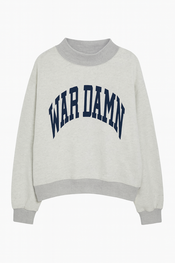 Aubie Reversible Mockneck Sweatshirt is reversible with the words "War Damn" on one side and "Tigers" on the other, in the color Heather Grey with Navy lettering. Oversized fit no matter what size you choose. Limited quantity and a Must have for any Auburn Fan.