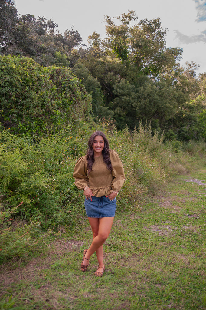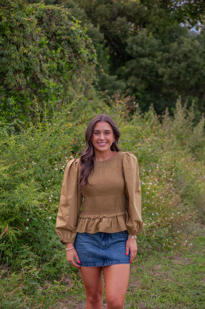 Bristol Poplin Top makes a statement in this smocked olive green color that’s as easy to wear as it is stylish. The puff sleeves and ruffle trim bring a touch of chic, while the cinched cuffs add just the right structure. Its smocked fit flatters every figure, making it your go-to blouse for both casual and dressed-up moments.
